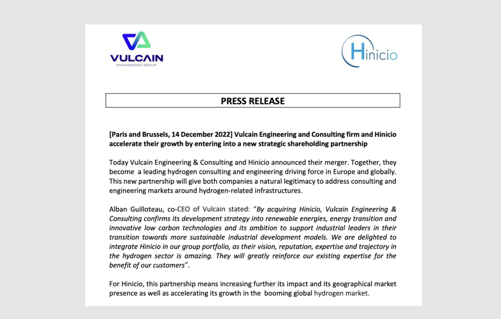 It is our great pleasure to inform you that today Vulcain Engineering & Consulting Group and Hinicio have decided to join forces. By getting a new partner and majority investor on board, we will be able to grow faster and have even greater impact on energy transition through Hydrogen solutions. For Hinicio, this partnership means enhancing our employee value proposition, further increasing its impact and its geographic market presence as well as accelerating its growth in the booming global hydrogen market.